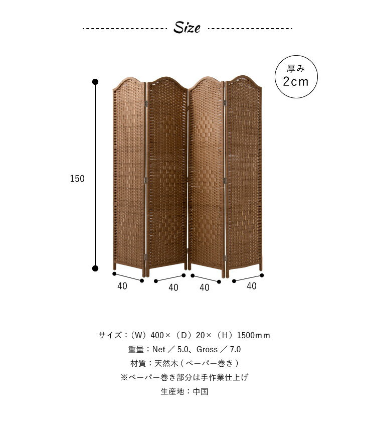 ■特長・シンプルでおしゃれな大きな編み目のダイヤ模様・折りたたみタイプで幅を自由に調整・使わないときはコンパクトにたためる・ペーパー素材なので軽々持ち運べる・合わせやすい2つのカラー展開サイズ: (W)400×(D)20×(H)1500mm重量:Net/5.0、Gross/7.0材質:天然木(ペーパー巻き) ※ペーパー巻き部分は手作業仕上げ生産地:中国【代引きについて】こちらの商品は、代引きでの出荷は受け付けておりません。