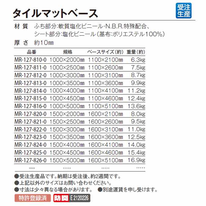 【タイルマットベース】 規格規格:1000×2000mm 規格規格:1000×2500mm 規格規格:1000×3000mm 規格規格:1000×3500mm 規格規格:1000×4000mm 規格規格:1000×4500mm 規格規格:1000×5000mm 規格規格:1500×2000mm 規格規格:1500×2500mm 規格規格:1500×3000mm 規格規格:1500×3500mm 規格規格:1500×4000mm 規格規格:1500×4500mm 規格規格:1500×5000mm 規格規格:2000×2500mm 規格規格:2000×3000mm 規格規格:2000×3500mm 規格規格:2000×4000mm 規格規格:2000×4500mm 規格規格:2000×5000mm 規格規格:2500×3000mm 規格規格:2500×3500mm 規格規格:2500×4000mm 規格規格:2500×4500mm 規格規格:2500×5000mm 規格規格:3000×3500mm 規格規格:3000×4000mm 規格規格:3000×4500mm 規格規格:3000×5000mm 【タイルマット】 ・タイルマットアウトハード ・タイルマットニュー パワーセル ・タイルマットテラレインライト ・専用 タイルマットベース 合計金額で送料無料の場合や送料無料の商品でも配送先が沖縄、北海道の場合は別途送料が必要になります。