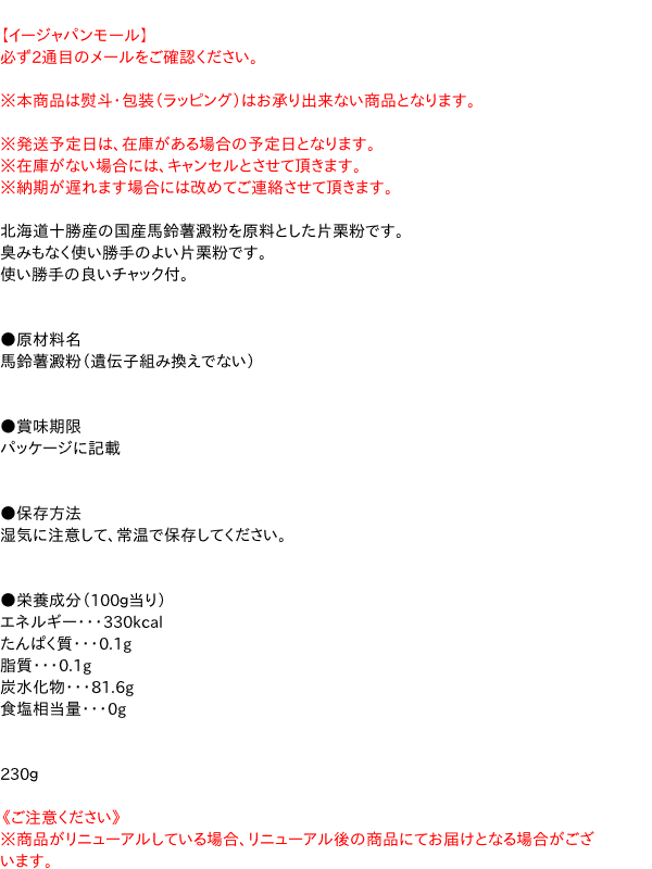 火乃国 北海道産片栗粉チャック付230g ×20個 はコチラ >>【イージャパンショッピングモール】内のみのお買い物は、送料一律でどれだけ買っても同梱する事が出来ます。
