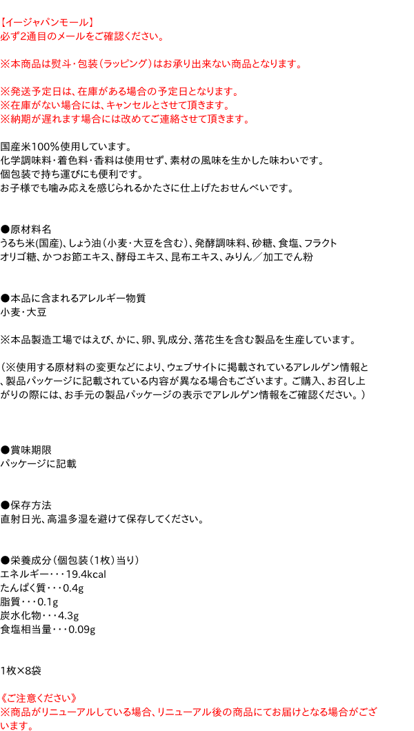 ●原材料名 うるち米(国産)、しょう油(小麦・大豆を含む)、発酵調味料、砂糖、食塩、フラクトオリゴ糖、かつお節エキス、酵母エキス、昆布エキス、みりん/加工でん粉 ●本品に含まれるアレルギー物質 小麦・大豆 ※本品製造工場ではえび、かに、卵、乳成分、落花生を含む製品を生産しています。