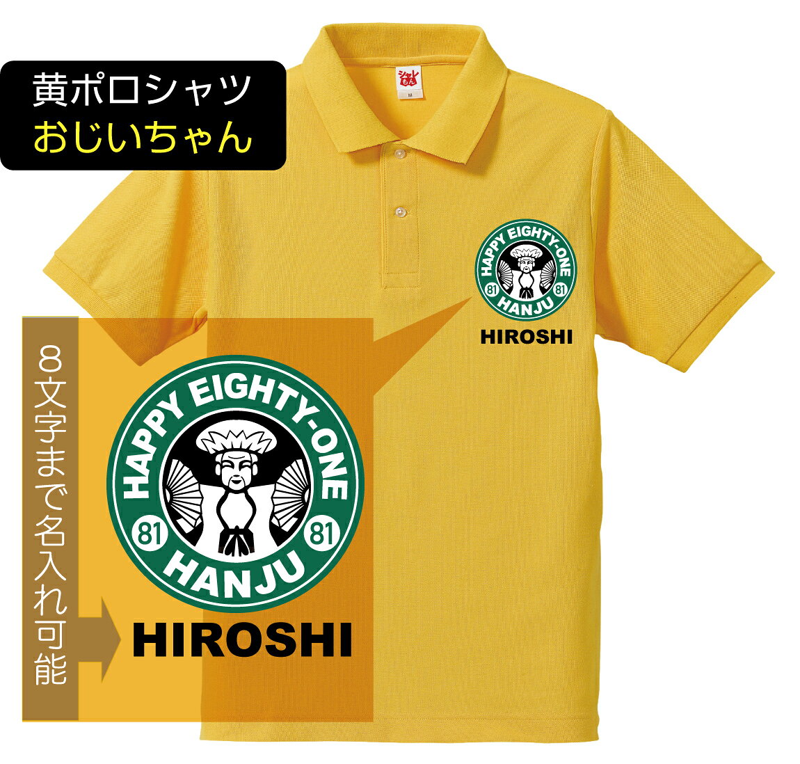 男性にはおじいちゃんデザインを、女性にはおばあちゃんデザインを選んでくださいね! しかも、ロゴマークの下にお好きな8文字まで名前を入れることができますので、オリジナル感もバツグン!! 名入れ文字の書体はゴシック体となります。