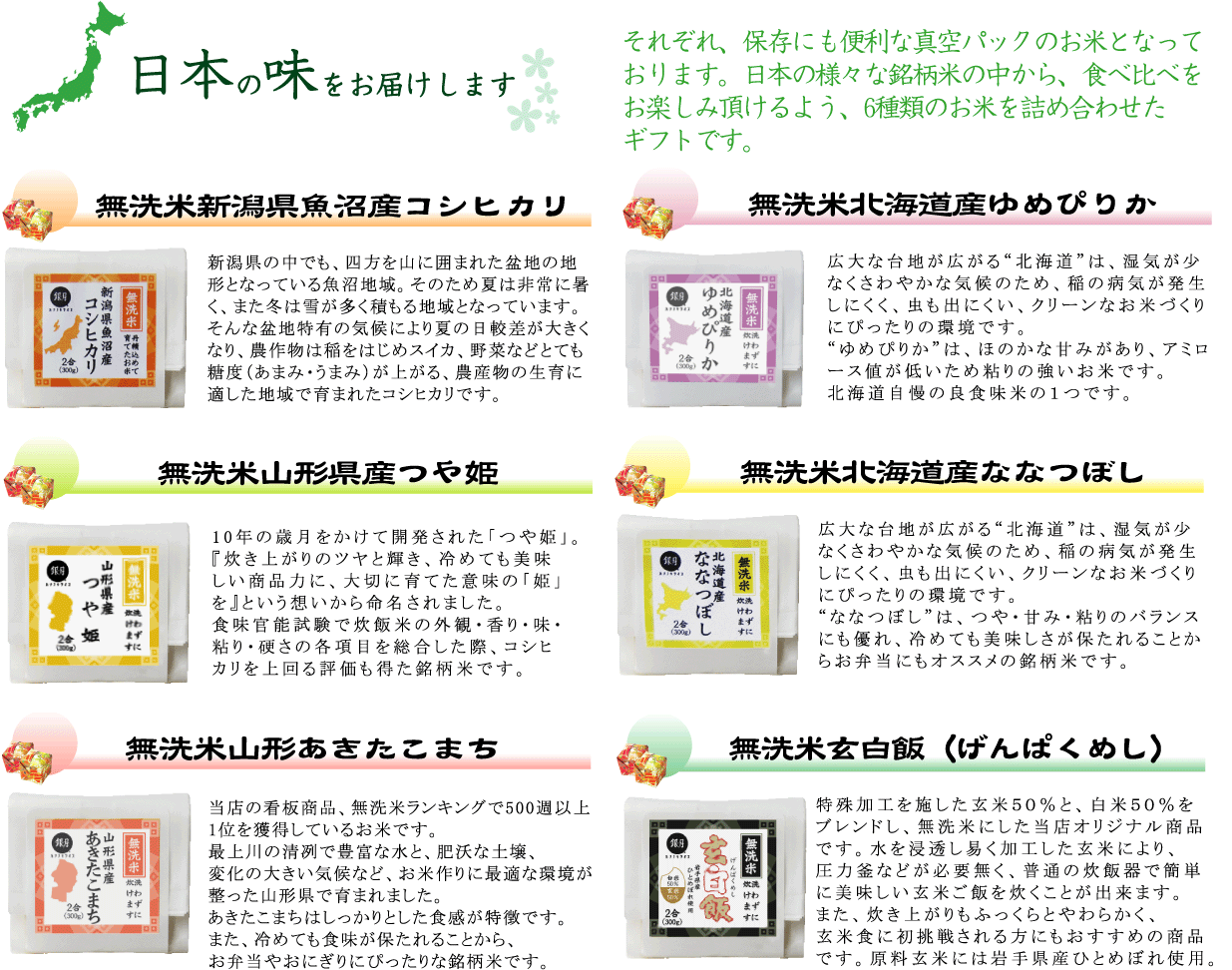 無洗米食べ比べセット6種(2合300gx9袋 計2.7kg) 送料無料 30年産 [魚沼コシヒカリx2/山形あきたこまちx2/山形つや姫x2/北海道ゆめぴりかx1/ななつぼしx1/玄白飯x1]ギフト/内祝/お祝/お礼/歳暮/中元/[北海道沖縄送料740円]